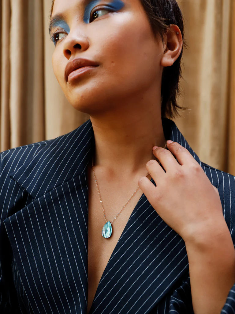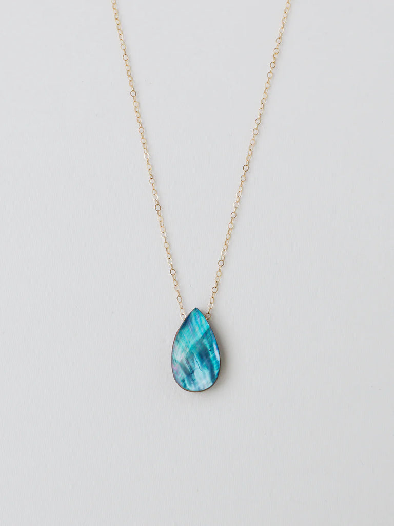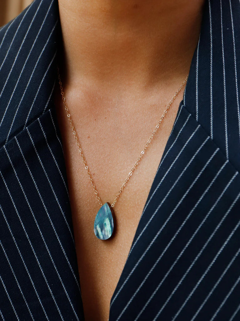 Pendant necklace with a simple and classic raindrop design made with Mother of Pearl veneer.