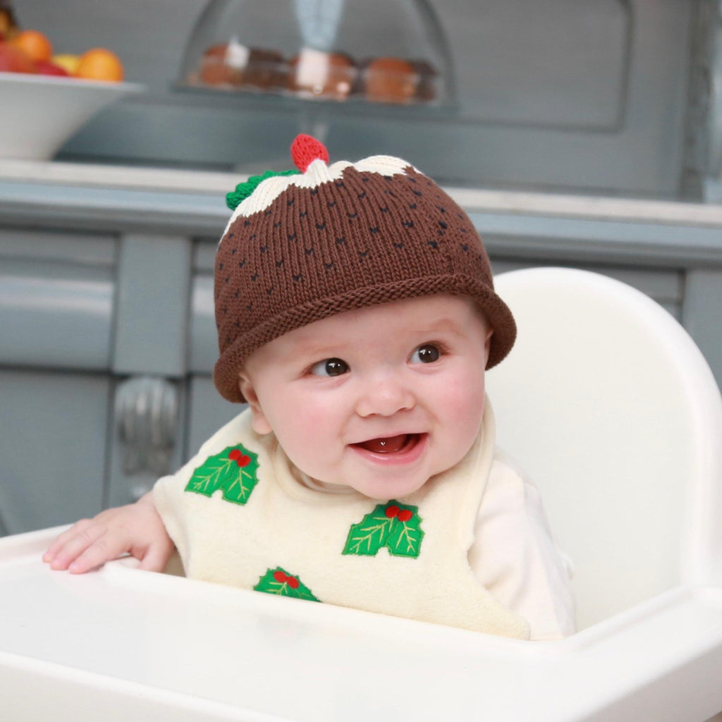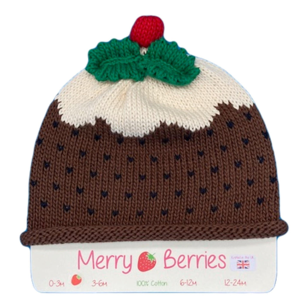 Christmas Pudding knitted baby hat. Available in 3 sizes- 3-6 months, 6-12 months and 12-24 months. Knitted in the UK by Merry Berries. 100% cotton.